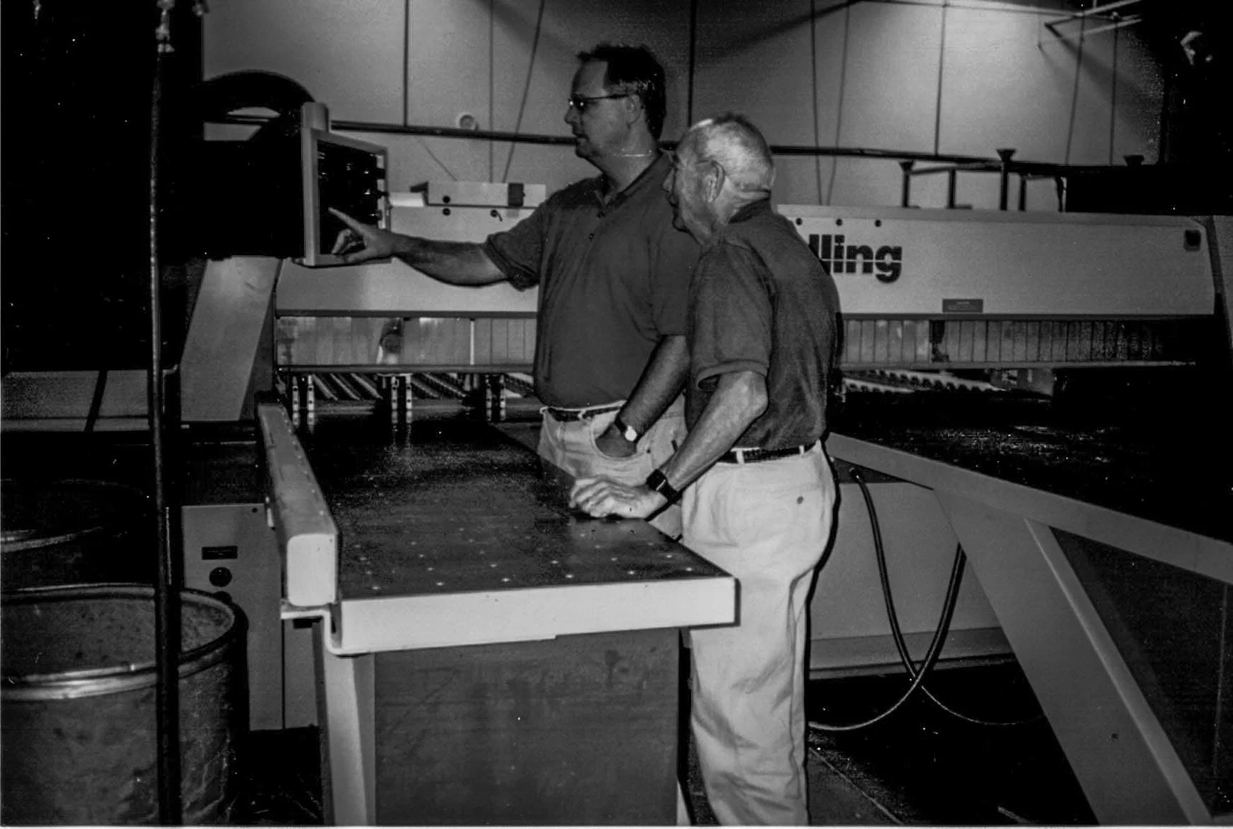 Carl Raedeker showing father Robert Raedeker how to use numerical controlled beam saw, circa 1996.